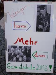 Ab 15.30 Uhr sammelten sich Kinder, Mütter und Väter am Elsa-Brunnen, um für die Gesamtschule in 2010 zu plädieren. Gegen 16.00 Uhr setzten sich über 120 Menschen in Richtung Rathaus, wo der Rat tagte,. mit Transparenten, Buttons und Flyern in Bewegung sorgten so für ein ungewohntes Bild in der Fußgängezone....